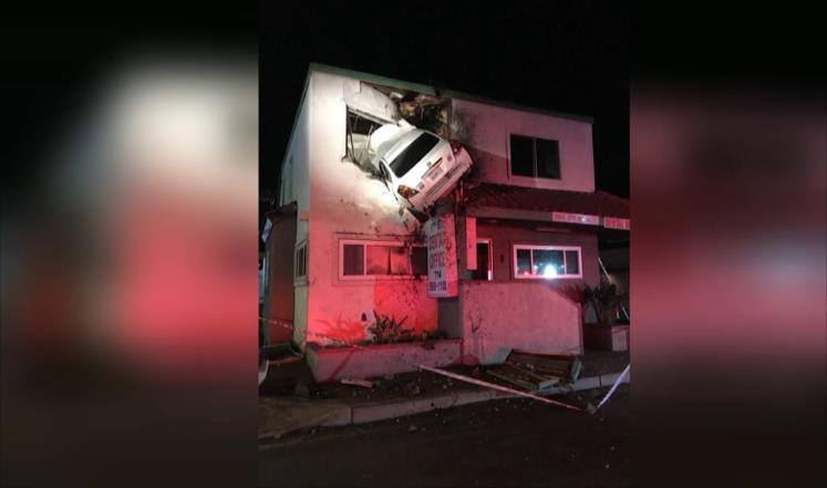 حطم سائق سيارة في ولاية كاليفورنيا بأميركا، كل قواعد المرور والطبيعة، عندما طارت سيارته في الهواء واخترقت جدار الطابق الثاني في مبنى على جانب الطريق، ما أسفر عن إصابة شخصين.