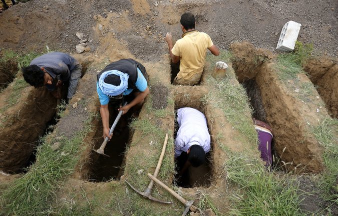 يمنيون يحفرون مقابر لضحايا غارة جوية في أغسطس (وكالة بريسفوتو الأوروبية)
