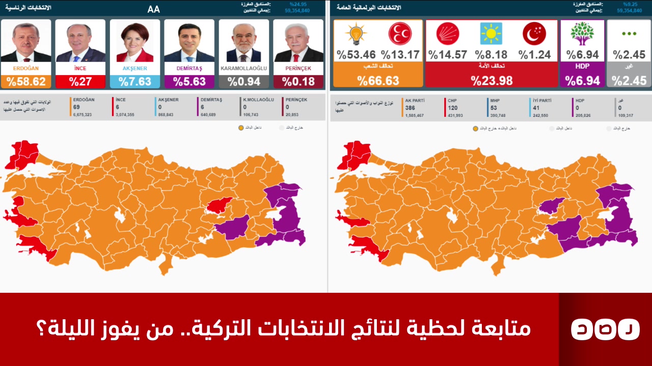بعد فرز 24 من الأصوات أردوغان يحصل على 58% ومحرم إنجه 26%.