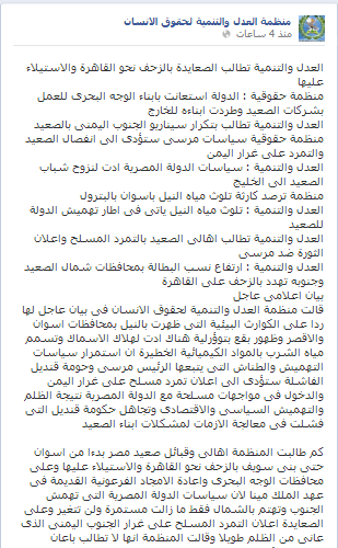 وأكدت المنظمة في بيانها أن ذلك يأتي ردا على الكوارث البيئية التي ظهرت بالنيل بمحافظات أسوان والأقصر، وظهور بقع بترولية هناك أدت لهلاك الأسماك وتسمم مياه الشرب بالمواد الكيميائية الخطيرة، مع استمرار سياسات التهميش التي يتبعها الرئيس مرسى وحكومة قنديل.