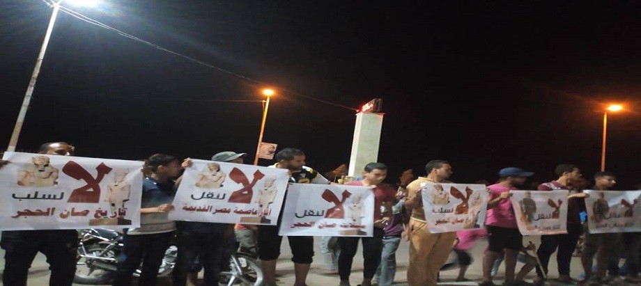 ورفع المحتجون لافتات حملت عبارات «لا لنقل آثار عاصمة مصر القديمة.. لا لسلب تاريخ صان الحجر»