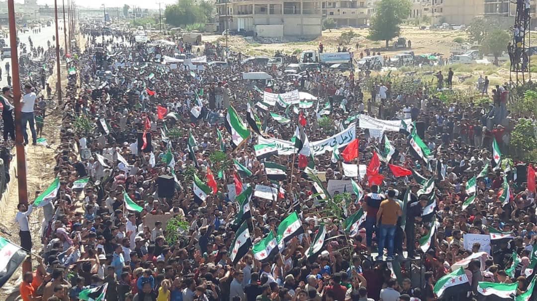 «لا بديل عن اسقاط النظام».. آلاف السوريون يتظاهرون بمدينة إدلب المحاصرة