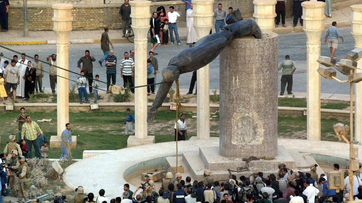 ثم أطيح بتمثال حديدي ضخم لصدام حسين، لكن كان يرافق سقوط بغداد المفاجئ مقاومة واسعة النطاق لقوات التحالف، واضطرابات ضخمة، حيث تم نهب المباني الحكومية بشكل كبير وازداد معدل الجرائم.