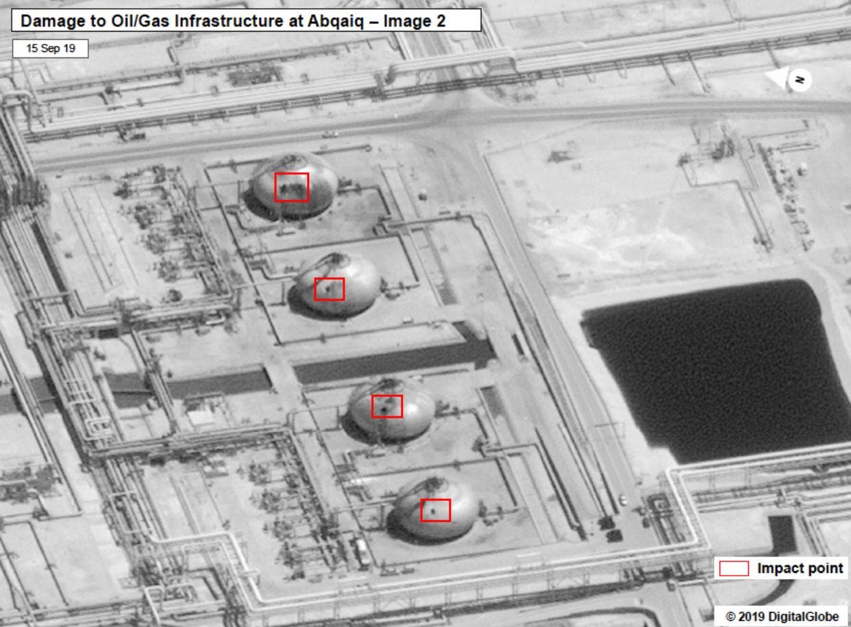ونشرت وزارة الدفاع الأميركية، الإثنين، صورا جوية التقطت بالأقمار الصناعية، لأعمدة دخان على منشأتي بقيق وخريص النفطتين في السعودية، اللتين تم استهدافهما بطائرات مسيرة.