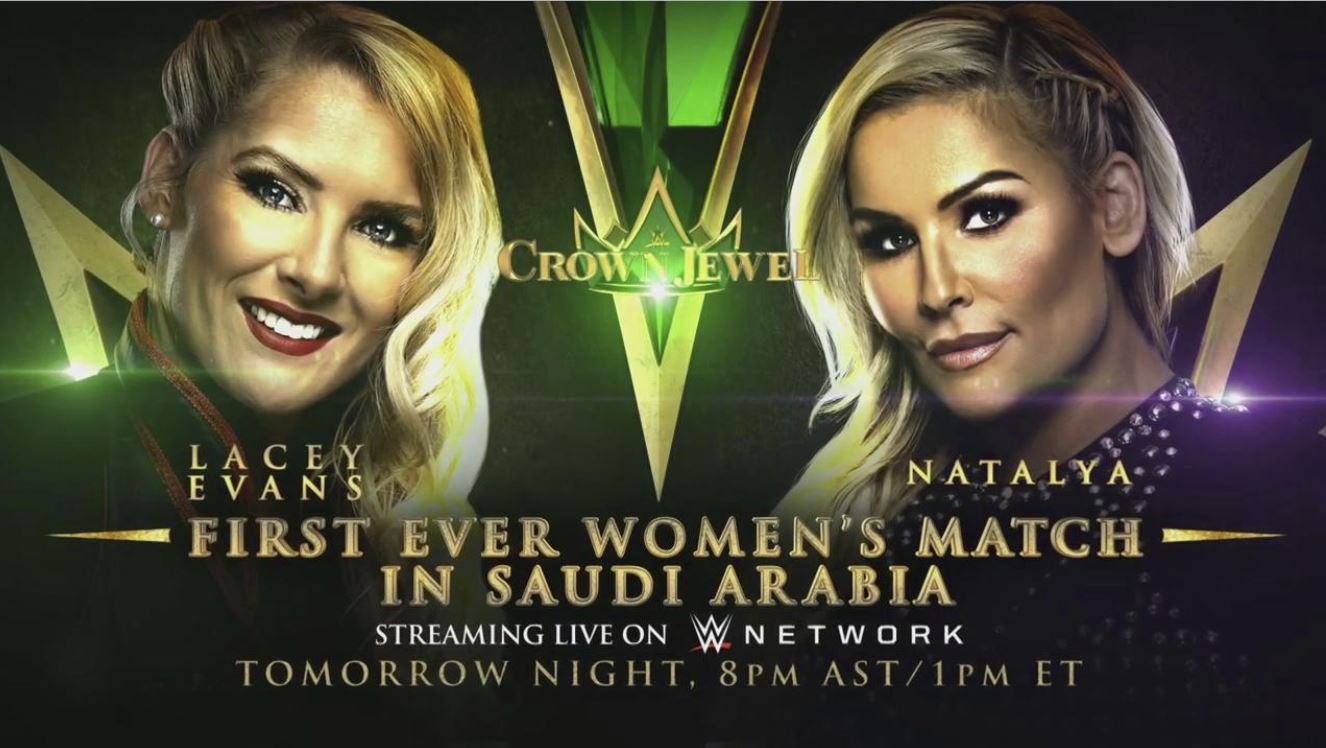 BREAKING: As just announced by @MichaelCole, @LaceyEvansWWE and @NatbyNature will go one-on-one in the first-ever Women's match in Saudi Arabia TOMORROW at #WWECrownJewel! pic.twitter.com/te7cJGutEU