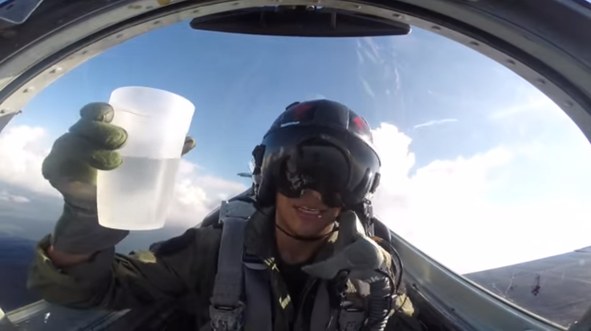 ويظهر الفيديو طيار يقوم بملء كوب بالمياه داخل طائرة حربية ثم يخلع قناع الأكسجين ويشرب من الكوب.