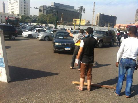 كما قام عدد من الصبية يحملون عصيان خشبية بإيقاف حركة المرور بميدان التحرير.