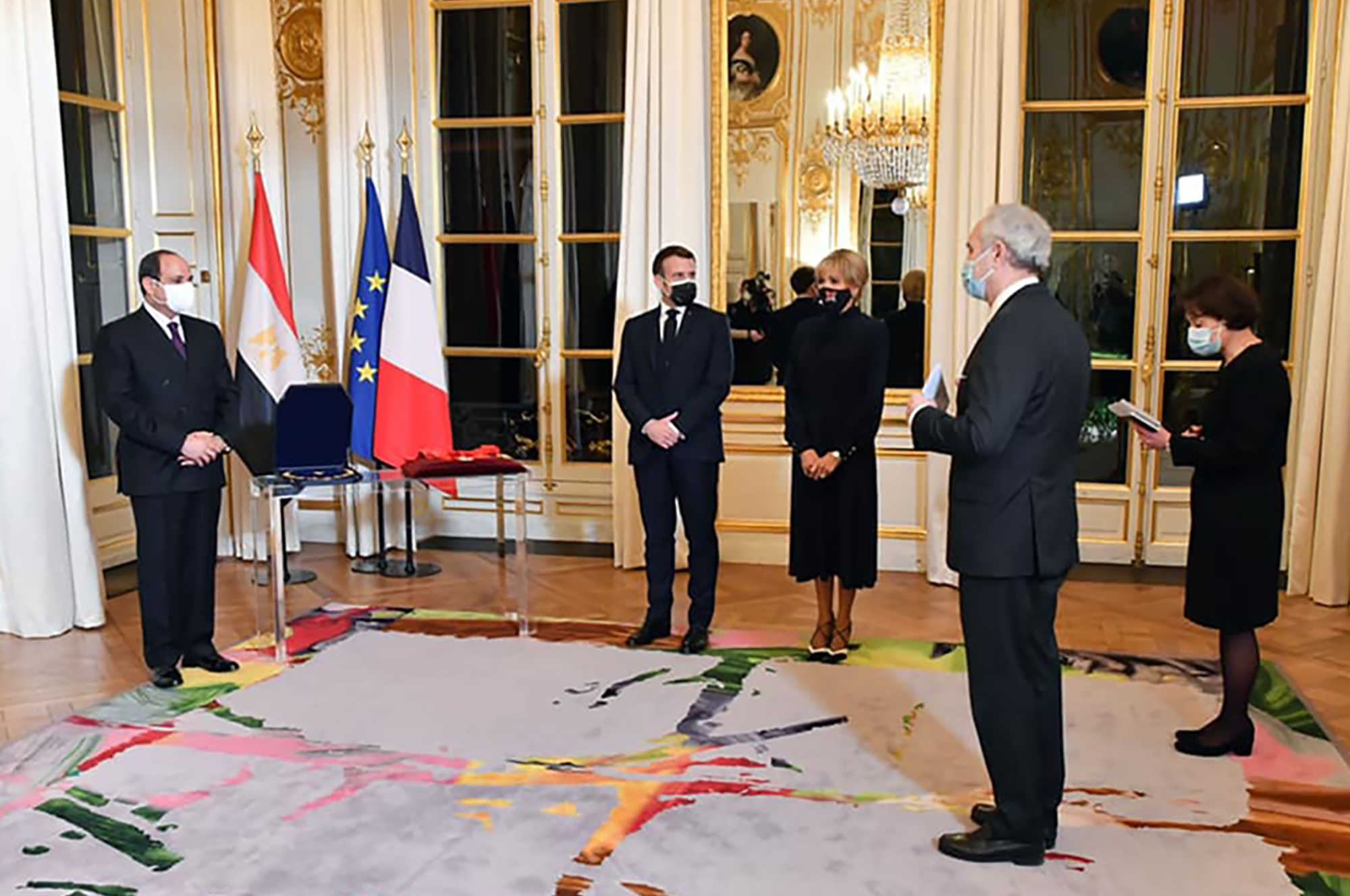 A handout picture released by the Egyptian Presidency shows Egypt's President Abdel Fattah al-Sisi (L) during an official reception in which he was awarded with the Legion d'Honneur (Legion of Honour) at the Elysee Palace on December 7, 2020 by his French counterpart Emmanuel Macron (2nd L) alongside his wife Brigitte in Paris. - Macron has rejected criticism of his close ties with visiting Egyptian strongman Abdel Fattah al-Sisi, saying that to take a tougher line on respect for human rights would be "counterproductive". (Photo by - / Egyptian Presidency / AFP) / === RESTRICTED TO EDITORIAL USE - MANDATORY CREDIT "AFP PHOTO / HO / EGYPTIAN PRESIDENCY' - NO MARKETING NO ADVERTISING CAMPAIGNS - DISTRIBUTED AS A SERVICE TO CLIENTS ==