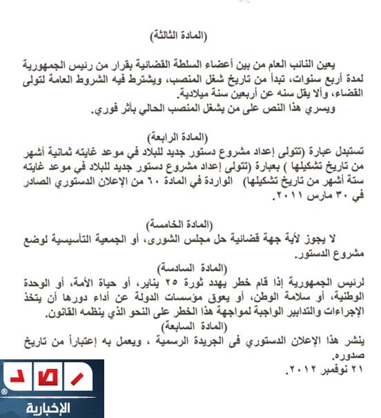 تعديل نص المادة الخاصة بتشكيل الجمعية التأسيسية بالإعلان الدستوري الصادر في 30 مارس 2011 أن "تتولى إعداد مشروع جديد للبلاد في مدة 4 أشهر من تاريخ تشكيلها إلى أن تتولى إعداد مشروع دستور جديد للبلاد في موعد غايته 6 أشهر من تاريخ تشكيله.
