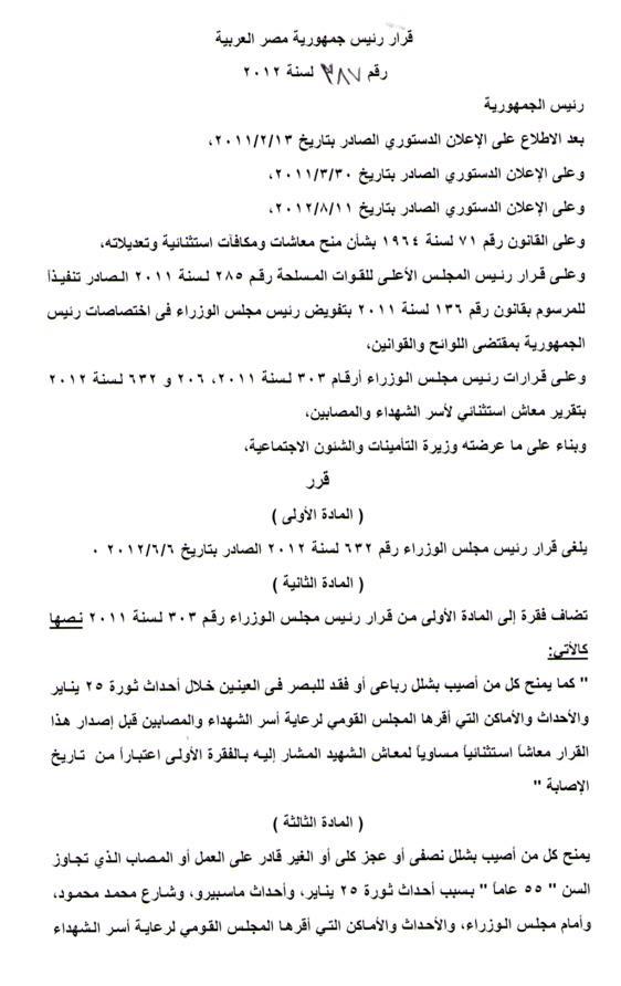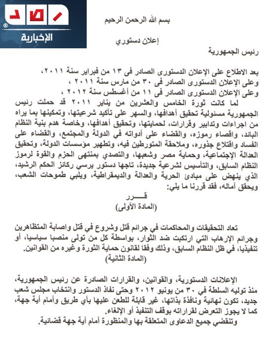 أصدر الرئيس محمد مرسي إعلانًا دستوريا جديدًا مساء اليوم الخميس، يقضي بمنع حل الجمعية التأسيسية، ويحصن قرارات رئيس الجمهورية، ويجعلها نهائية ونافذة، ولا يمكن وقف تنفيذها أمام أي جهة قضائية، ويقضي بإعادة محاكمة الرئيس السابق حسني مبارك ورموز نظامه، بتهم قتل الثوار وإفساد الحياة السياسية.