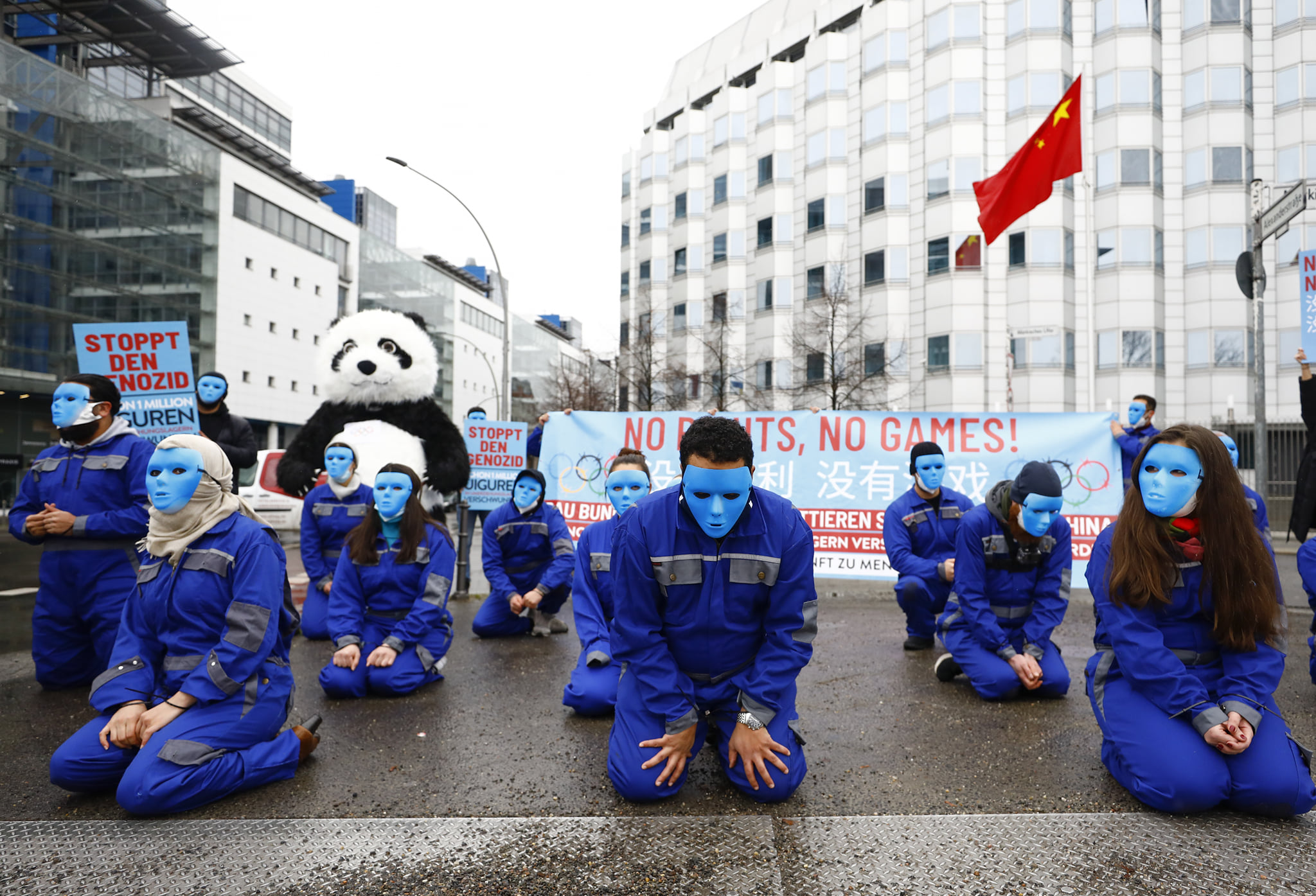 ورفعوا لافتات عليها عبارات من قبيل: «لا للألعاب إذا لم يكن هناك حقوق»، «أوقفوا الإبادة الجماعية ضد الأويجور» «أطلقوا سراحهم».