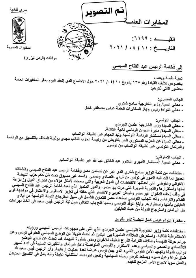 ونشر النشطاء وثائق منسوبة إلى المخابرات العامة المصرية تضمنت مذكرة من مدير المخابرات عباس كامل إلى رئيس النظام عبد الفتاح السيسي بتاريخ 11 أبريل 2021، حول ما دار في اجتماع في القاهرة، ضم كلا من عباس كامل ووزير الخارجية المصري سامح شكري، ونظيره التونسي عثمان الجرندي، إلى جانب مديرة الديوان الرئاسي التونسي نادية عكاشة، ومستشار سعيّد وليد الحجام، والنائب عن الحزب الدستوري الحر مجدي بوذينة.