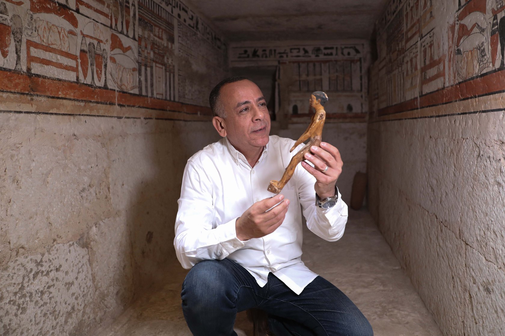 وأوضح وزيري في مؤتمر صحفي بمقر الاكتشاف، أنه يتضمن 5 مقابر منقوشة من عصري الدولة القديمة «2686 ق.م./ 2181 ق.م» والانتقال الأول «2181 ق.م./ 2055 ق.م».