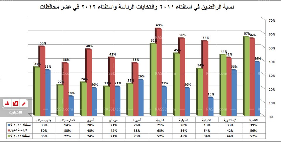 ففي القاهرة كانت نسبة الرفض للإعلان الدستوري بمارس 39%، وحصل الفريق أحمد شفيق على 56% في انتخابات الرئاسة ثم زادت نسبة الرافضين للدستور إلى 57%.بزيادة 18% عن استفتاء مارس 2011