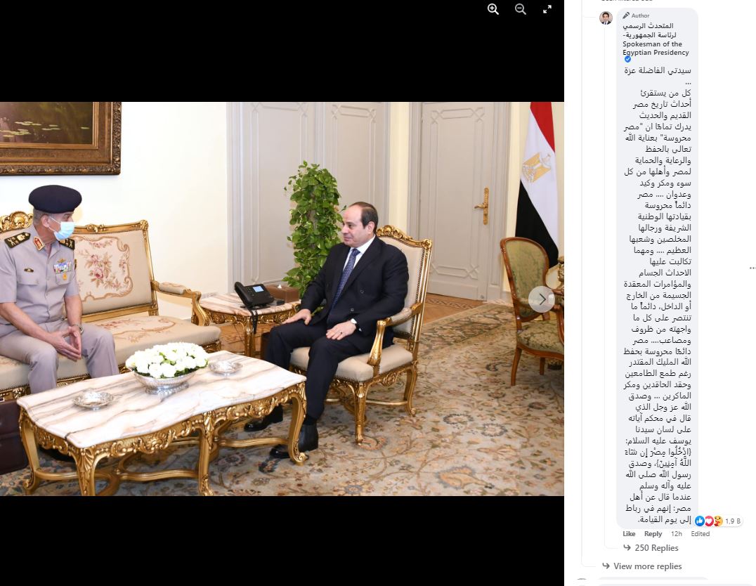 أثار المتحدث باسم رئاسة الجمهورية جدلا على حسابه على موقع فيس بوك، بعدما رد على سيدة عبرت عن قلقها من الوضع في مصر قائلا:«مصر محروسة بعناية الله وبقيادتها الوطنية ورجالها المخلصين وشعبها العظيم».