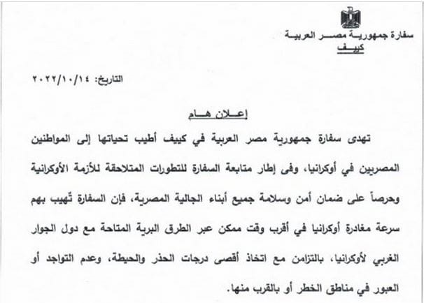 طالبت السفارة المصرية في كييف المصريين بسرعة مغادرة أوكرانيا في أقرب وقت ممكن عبر الطرق المتاحة مع دول الجوار بالتزامن مع تصاعد وتيرة الحرب.