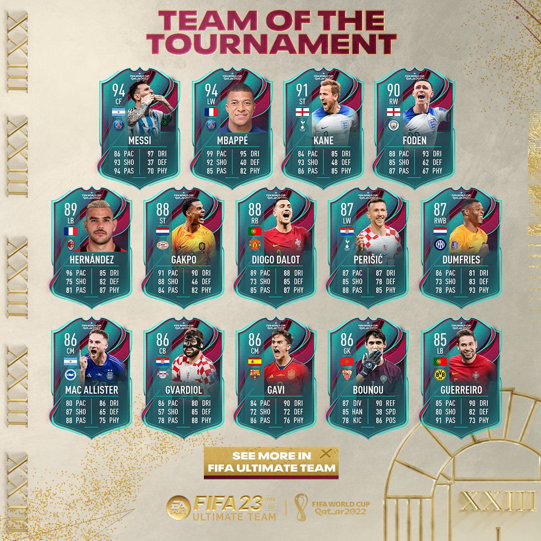 وتواجد في التشكيلة العديد من نجوم المونديال، على غرار الأرجنتيني ليونيل ميسي، والفرنسي كيليان مبابي، بالإضافة إلى ثنائي منتخب إنكلترا، هاري كين وفيل فودين.
