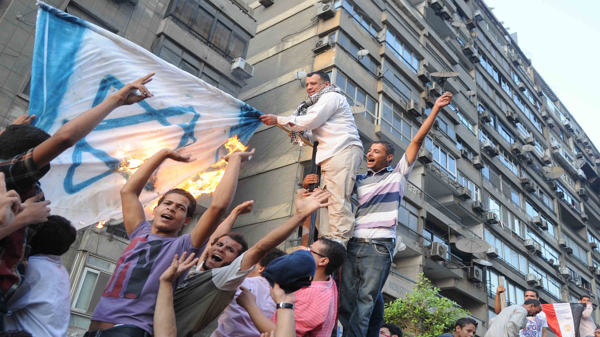 Egyptian demonstrators burn an Israeli flag as others try to demolish a wall recently built outside the Israeli embassy in Cairo to protect the building on September 9, 2011. Around 1,000 people had gathered outside the building housing the mission and attacked the wall with hammers and a large metal bar, while military police nearby did nothing to stop them. AFP PHOTO/MOHAMED HOSSAM (Photo credit should read MOHAMED HOSSAM/AFP/GettyImages)