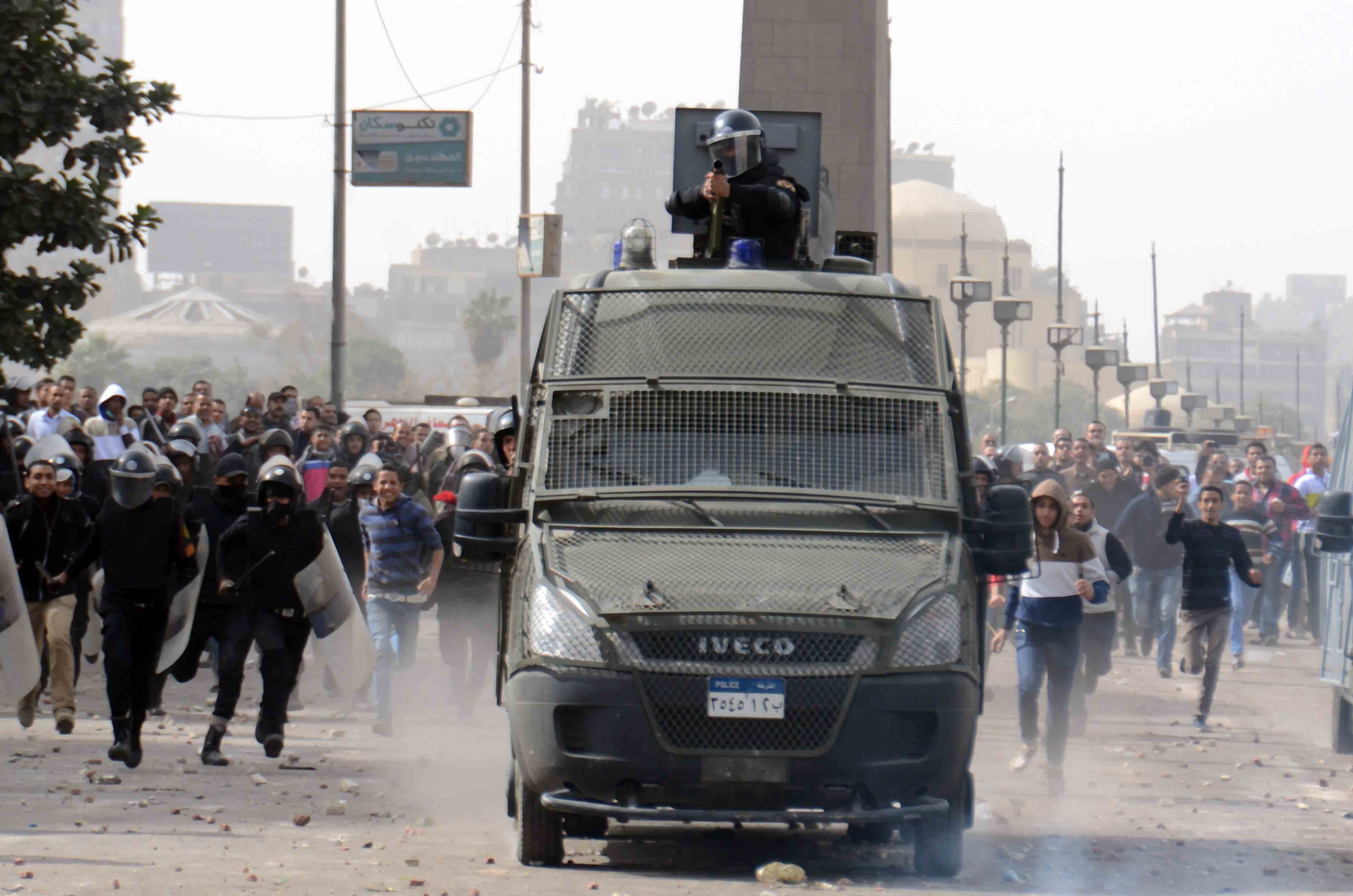 كما قام احد الملثمين بإطلاق خرطوش على قوات الأمن مما أدى لسقوط العشرات من جنود الأمن المركزي وتم نقلهم إلى المستشفى.
