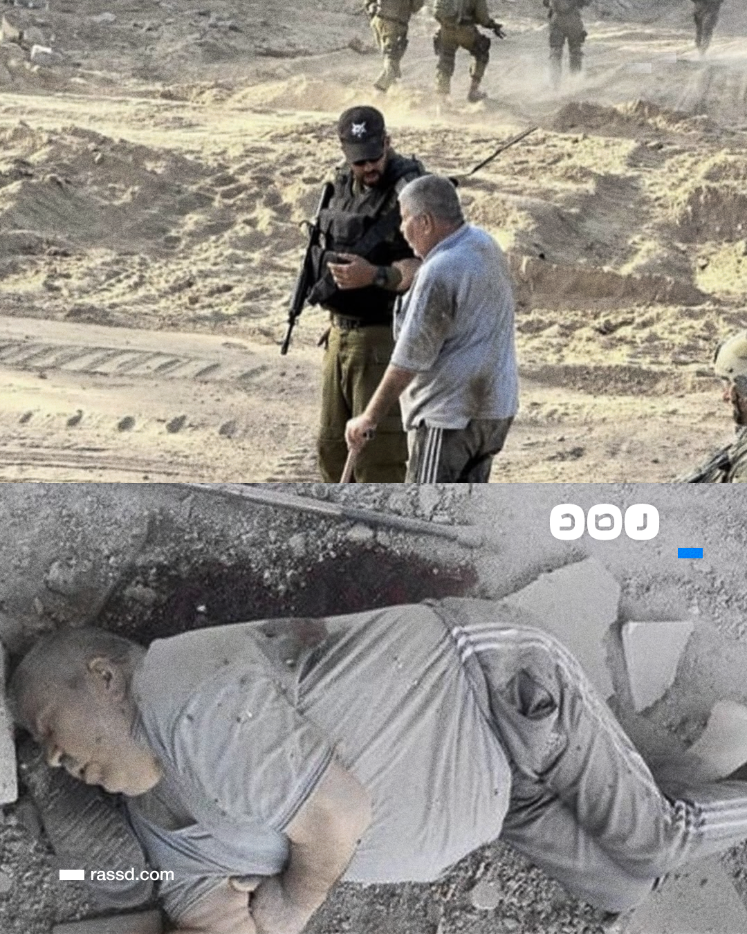 وتابع الأورومتوسطي نشر الجيش الإسرائيلي صورة تظهر أحد جنوده وهو يتحدث مع المسن “بشير حجي” (79 عاما) من سكان حي الزيتون في مدينة غزة، أثناء عبوره طريق “صلاح الدين” الرئيسي للادعاء بمساعدته المدنيين الفلسطينيين وتوفير الحماية لهم أثناء نزوحهم.