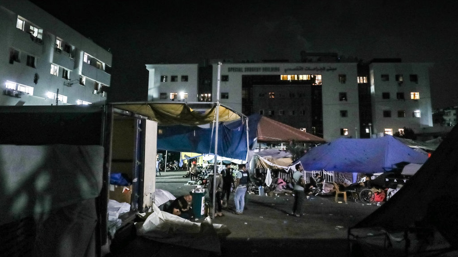 People wait in tent shelters in the darkness as fuel for electricity generation runs out, outside Al-Shifa hopsital in Gaza City early on November 3, 2023, amid the ongoing battles between Israel and the Palestinian group Hamas. (Photo by Dawood NEMER / AFP) (Photo by DAWOOD NEMER/AFP via Getty Images)