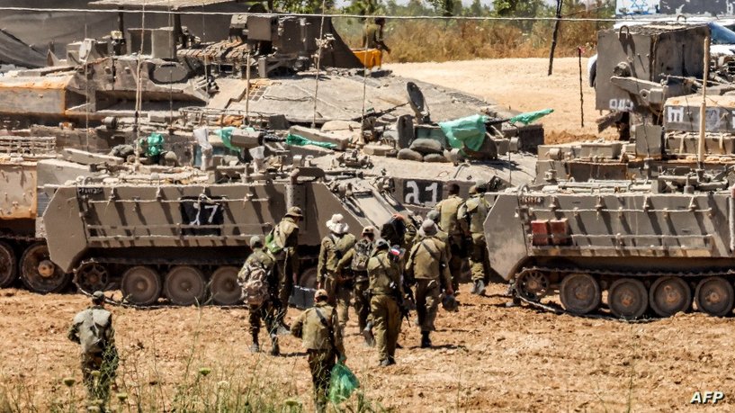 Israeli army soldiers approach infantry-fighting vehicles (IFVs) positioned in southern Israel near the border with the Gaza Strip on May 8, 2024, amid the ongoing conflict in the Palestinian territory between Israel and the Hamas movement. (Photo by Jack Guez / AFP)