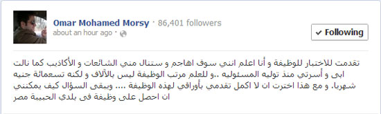 وقال نجل الرئيس فى مدونة تداولتها مواقع التواصل الاجتماعى "فيس بوك": تقدمت للاختبار للوظيفة، وأنا أعلم أننى سوف أُهاجم وستنال منى الشائعات والأكاذيب، كما نالت من أبى وأسرتى منذ توليه المسئولية، وللعلم مرتب الوظيفة ليس بالآلاف ولكنه تسعمائة جنيه شهريا ومع هذا اخترت ألا أكمل تقديم أوراقى لهذه الوظيفة.