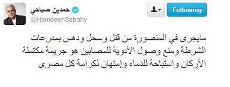 أكد حمدين صباحي- مؤسس التيار الشعبي- فجر اليوم (السبت) في تغريدة له عبر حسابه الشخصي على "تويتر" أن ما يجري في المنصورة من قتل وسحل ودهس بمدرعات الشرطة ، ومنع وصول الأدوية للمصابين هو جريمة مكتملة الأركان واستباحة للدماء وامتهان لكرامة كل مصري".