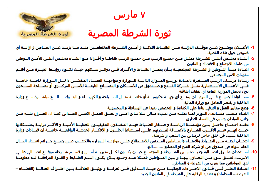 أكد الرائد أحمد عكاشة– أن فعاليات يوم 7 مارس التي دعت إليها صفحة "ثورة ضباط شرطة مصر" على موقع "الفيسبوك" ستضمن التظاهر أمام مديرات الأمن ورفع مطالبهم التي من ضمنها توضيح موقف الدولة من الضباط الثلاثة وأمين الشرطة المختطفين منذ عامين وإزالة أي غموض حول هذه القضية،و إعادة مبدأ توطين الشرطة بحيث تكون أماكن عملهم بجوار أماكن سكنهم ، والمساواة في المرتبات ووضع معايير للتنقل والترقي داخل جهاز الشرطة وإعادة النظر في قانون الإجراءات الجنائية الملئ بالثغرات بالإضافة إلى عدد أخر من المطالب .