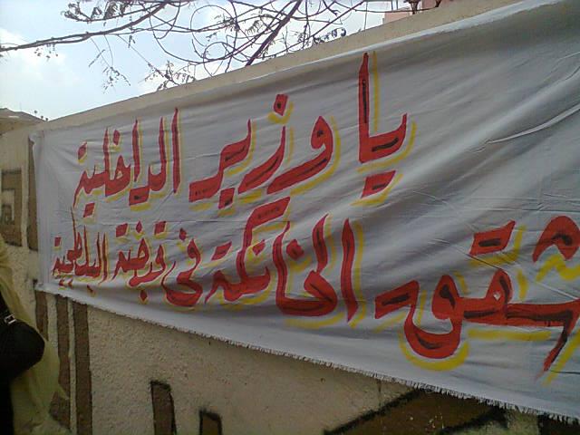 ورفع المتظاهرين لافتات كتب عليها "يا وزير الداخلية شقق الخانكة في قبضة البلطجية".