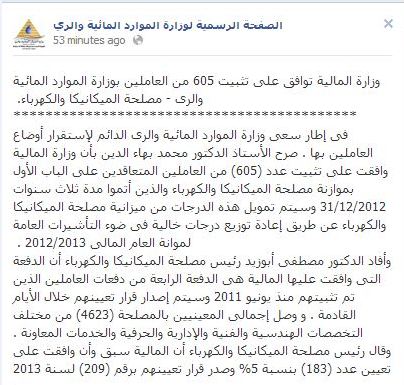 وأفاد الدكتور مصطفى أبو زيد- رئيس مصلحة الميكانيكا والكهرباء – عبر الصفحة الرسمية لوزارة الموارد المائية والري على موقع التواصل الاجتماعي "فيسبوك" أن الدفعة التي وافقت عليها المالية هي الدفعة الرابعة من دفعات العاملين الذين تم تثبيتهم منذ يونيو 2011، وسيتم إصدار قرار تعيينهم خلال الأيام القادمة .