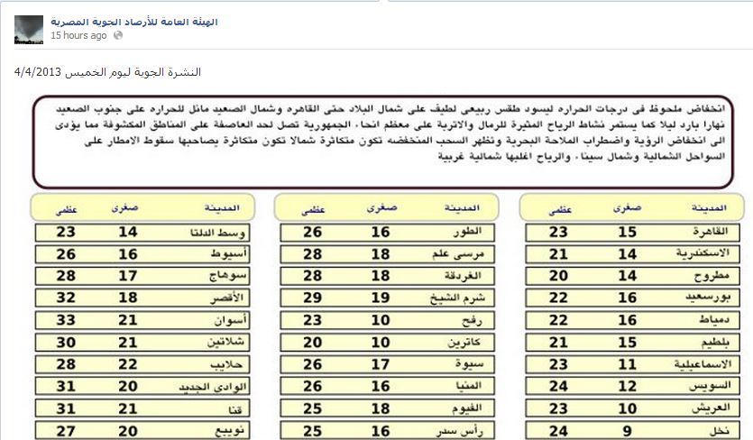 وأشارت الهيئة عبر صفحتها عل موقع التواصل الاجتماعي "فيسبوك"  استمرار نشاط الرياح المثيرة للرمال والأتربة على معظم أنحاء الجمهورية تصل لحد العاصفة على المناطق المكشوفة  ، مما يؤدي لانخفاض الرؤية ،  واضطراب الملاحة البحرية ، وتظهر السحب المنخفضة وتكون متكاثرة شمالا يصاحبها سقوط الأمطار على السواحل الشمالية ، وشمال سيناء .