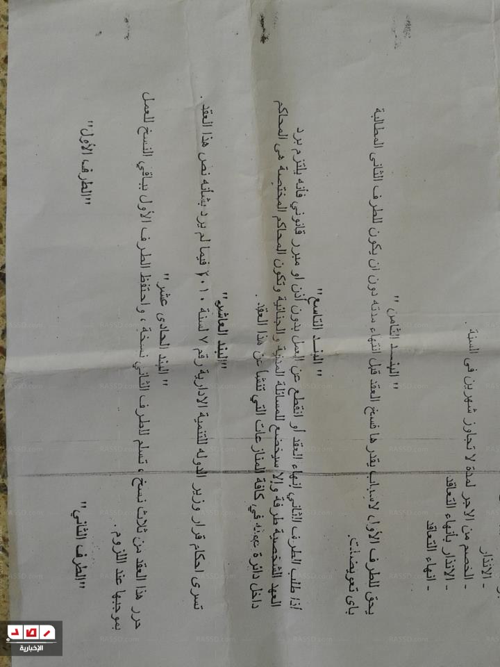 وينص العقد الذي حصلت شبكة رصد على نسخة منه :إنه يحق للطرف الأول لأسباب يقدرها فسخ العقد قبل انتهاء مدته دون أن يكون للطرف الثاني المطالبة بأي تعويضات.