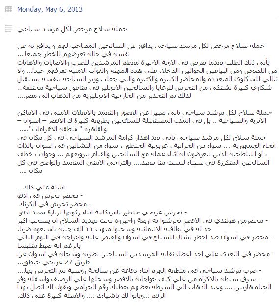 أطلق ائتلاف المرشدين السياحيين المستقلين أمس (الاثنين) حمله على مواقع التواصل الاجتماعي "فيسبوك " باسم "سلاح لكل مرشد سياحي" ، لمطالبة وزاره الداخلية بتوفير رخص السلاح لكل مرشد سياحي ، للدفاع عن السائحين المصاحب لهم ، والذين يتعرضون لمضايقات، و تحرشات ، فضلا عن الدفاع عن أنفسهم بسبب تعرضهم في الآونة الأخيرة ، للضرب والإهانه من اللصوص ومن البائعين المتجولين .