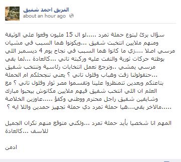وقال أدمن الصفحة في تدوينه له اليوم (الخميس): "سؤال برئ لبتوع حملة تمرد …..لو الـ 15 مليون وقعوا علي الوثيقة ومنهم ملايين انتخبت شفيق …ويكونوا هما السبب في مشيان مرسي أصلا ….زى ما كانوا هما السبب في نجاح يوم 4 ديسمبر…اللي بوظته حركات ثورية والتفت عليه وركبته تاني ..كالعادة …لما بقي مرسي يمشي ..ونرجع نعمل انتخابات رئاسية وننتخب شفيق …حتقولولنا زفت وهباب وفلول تاني؟".