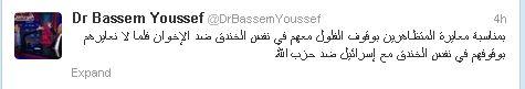 وتساءل باسم –خلال تغريده له علي موقع التواصل الاجتماعي (تويتر) – اليوم (الأربعاء) بمناسبة معايرة المتظاهرين بوقوف الفلول معهم في نفس الخندق ضد الإخوان فلما لا نعايرهم بوقوفهم في نفس الخندق مع إسرائيل ضد حزب الله ؟ .