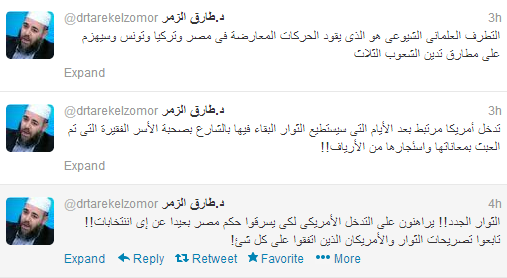 وأشار الزمر – من خلال تدوينه له علي موقع التواصل الإجتماعي " تويتر " صباح اليوم ( الخميس) – إلى أن تدخل أمريكا مرتبط بعد اﻷيام التى سيستطيع الثوار البقاء فيها بالشارع بصحبة اﻷسر الفقيرة التى تم العبث بمعاناتها واسئجارها من اﻷرياف .