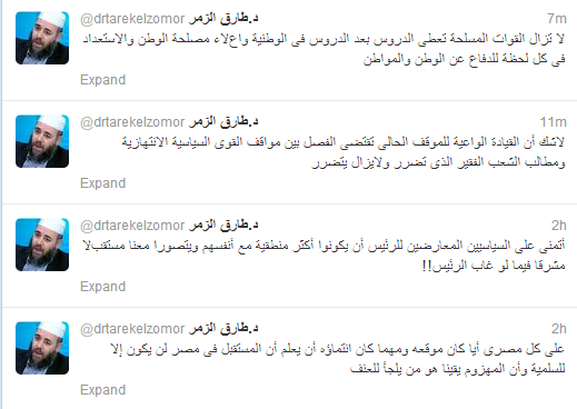 ووجه الزمر – من خلال تغريده له على " تويتر " – رسالة إلى السياسين المعارضين قائلا : " أتمنى على السياسيين المعارضين للرئيس أن يكونوا أكثر منطقية مع أنفسهم ويتصورا معنا مستقبلا مشرقا فيما لو غاب الرئيس " .