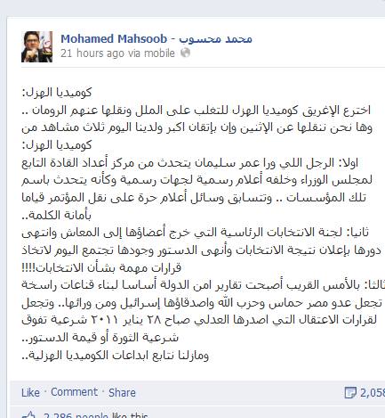 وصرح محسوب :"ما أسمعه من الرجل اللي ورا عمر سليمان وما نراه كل يوم لا يعبر إلا عن نتيجة ٣٠ سنة من تجريف العقول والكفاءات والقدرات بعد تحريف المال والثروة".