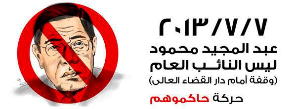 أطق بعض الشباب على موقع التواصل الاجتماعى " فيس بوك " اليوم الخميس  حملة "حاكموهم" لمحاكمة و عزل النائب العام المستشارعبد المجيد محمود و ذلك بعد عودته اليوم لممارسة عمله كنائب عام .
