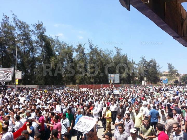 بينما يواصل المتظاهرون اعتصامهم بميدان رابعة العدوية واحتشد معهم عشرات الآلاف اليوم مرددين هتافات: "يا الله يا جبار إلي يخونا يولع النار"، "وبالطول بالعرض هنجيب السيسي الأرض".