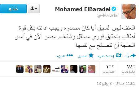 وأدان الدكتور محمد البرادعي، رئيس حزب الدستور وعضو جبهة الانقاذ، عبر تويتر، العنف، وطالب بسرعة التحقيق الفوري المستقل في الحادث.