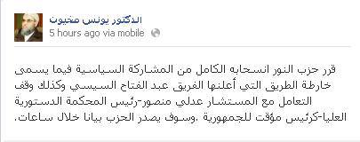 حيث أعلن الدكتور يونس مخيون، رئيس حزب النور، عبر حسابه على الفيس بوك إنسحاب الحزب بشكل كامل من المشاركة السياسية فيما يسمى خارطة الطريق التي أعلنها الفريق عبد الفتاح السيسي، مع وقف التعامل مع المستشار عدلي منصور-رئيس المحكمة الدستورية العليا-كرئيس مؤقت للبلاد ، مشيرٌا إلى أنه سيصدر بيانا خلال ساعات رداً على الأحداث التي شهدها مقر الحرس الجمهوري .