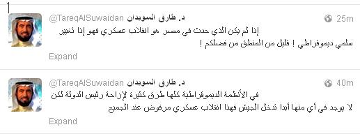 أعلن الداعية الاسلامى الدكتور طارق السويدان اليوم الجمعة عن رأيه في الانقلاب العسكري الذي أطاح بالرئيس المصري المنتخب الدكتور محمد مرسي، وأكد أنه "في الانظمة الديمقراطية توجد طرق كثيرة لإزاحة رئيس الدولة، لكن لا يوجد في اى منها تدخل الجيش فهذا انقلاب عسكري مرفوض عند الجميع".