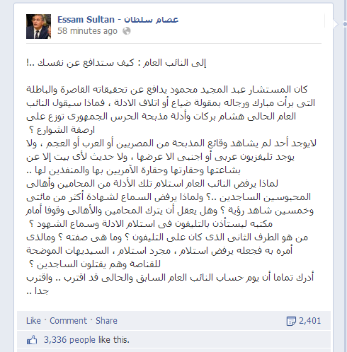 وتابع سلطان:" من هو الطرف الثانى الذى كان على التليفون ؟ وما هى صفته ؟ ومالذى أمره به فجعله يرفض استلام ، مجرد استلام ، السيديهات الموضحة للقناصة وهم يقتلون الساجدين ؟"، مختتماً: " أدرك تماما أن يوم حساب النائب العام السابق والحالى قد اقترب .. واقترب جدا".