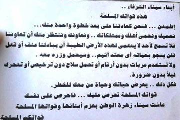 وفي تلك الأثناء قامت إحدى الطائرات العسكرية بإلقاء منشورات على مدينة العريش تطالب المواطنين فيها بالتعاون مع القوات المسلحة.