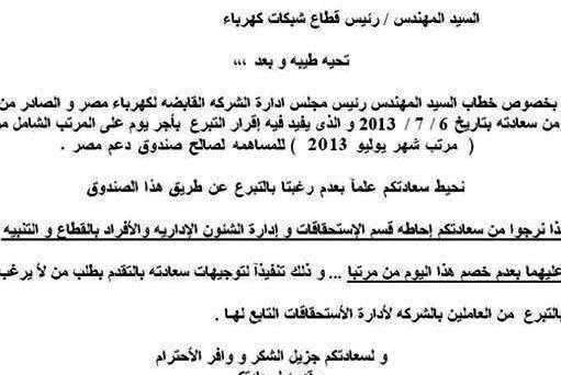 أبدى العاملون بالشركة القابضة لكهرباء مصر "فرع شمال سيناء" اليوم الاثنين عدم رغبتهم بالتبرع بأجر يوم من راتبهم لصالح صندوق دعم مصر.