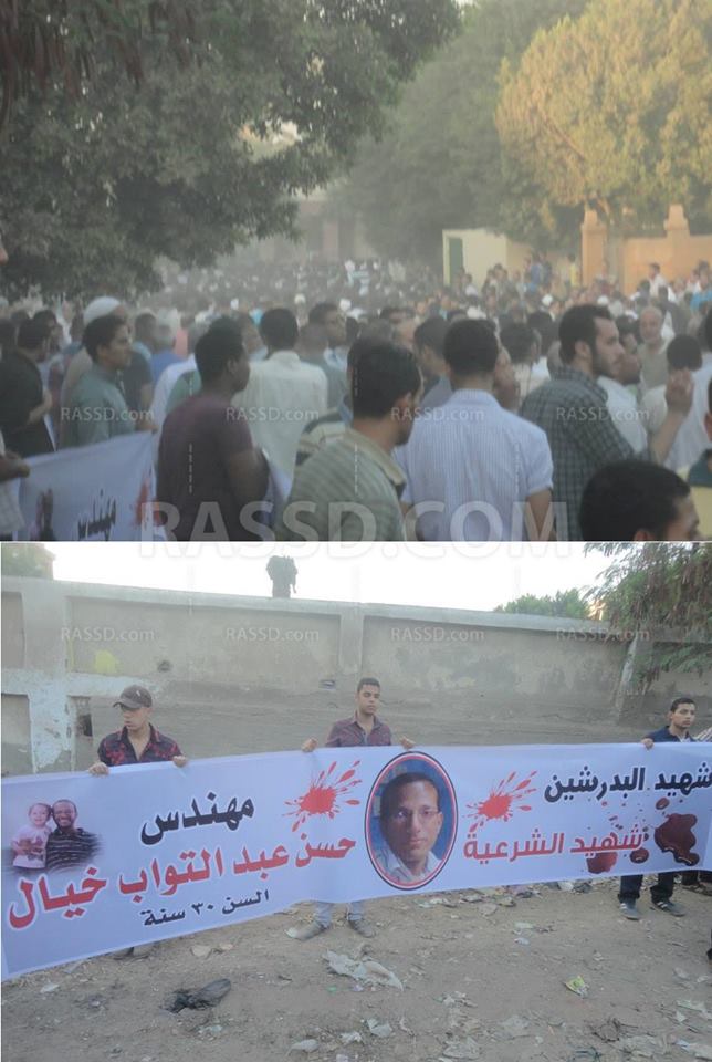 خرج المئات من المشيعين لتشييع جنازة المهندس حسن عبد التواب خيال بالبدرشين بمحافظة الجيزة والذي استشهد فجر اليوم (الثلاثاء) أمام المدرسة السعدية بشارع الجامعة إثر صدمه وآخرون بسيارة انطلقت بسرعة في وسط المسيرة القادمة من ميدان الجيزة وتم القبض على قائد السيارة والذي تبين أنه العقيد إسماعيل أحمد