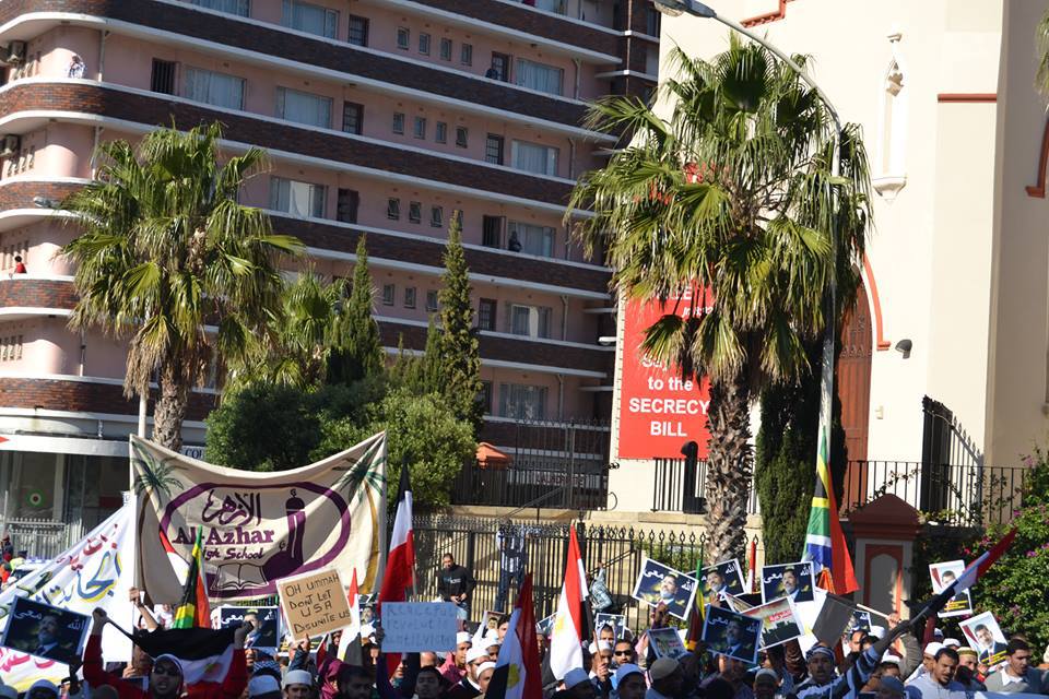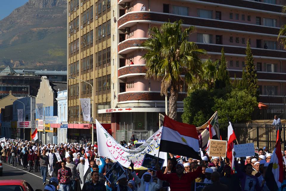 تظاهر أمس الخميس الآلاف في مدينة "كيب تاون" بجنوب أفريقيا أمام مبنى البرلمان  لرفض الانقلاب العسكري في مصر وتأييدا للشرعية المنتخبة .