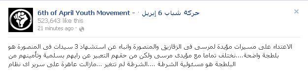 أدانت حركة 6 إبريل استشهاد 3 فتيات من المؤيدين للرئيس محمد مرسي فى مسيرة لرفض الانقلاب العسكري بالزقازيق.